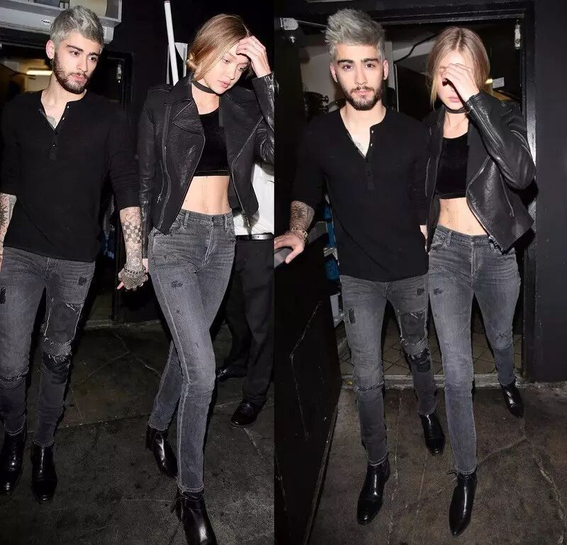 Zayn Malik与Gigi Hadid这组造型的关键在于同色的牛仔裤搭配黑色短靴,上身则搭配同样的黑色系,酷感十足。