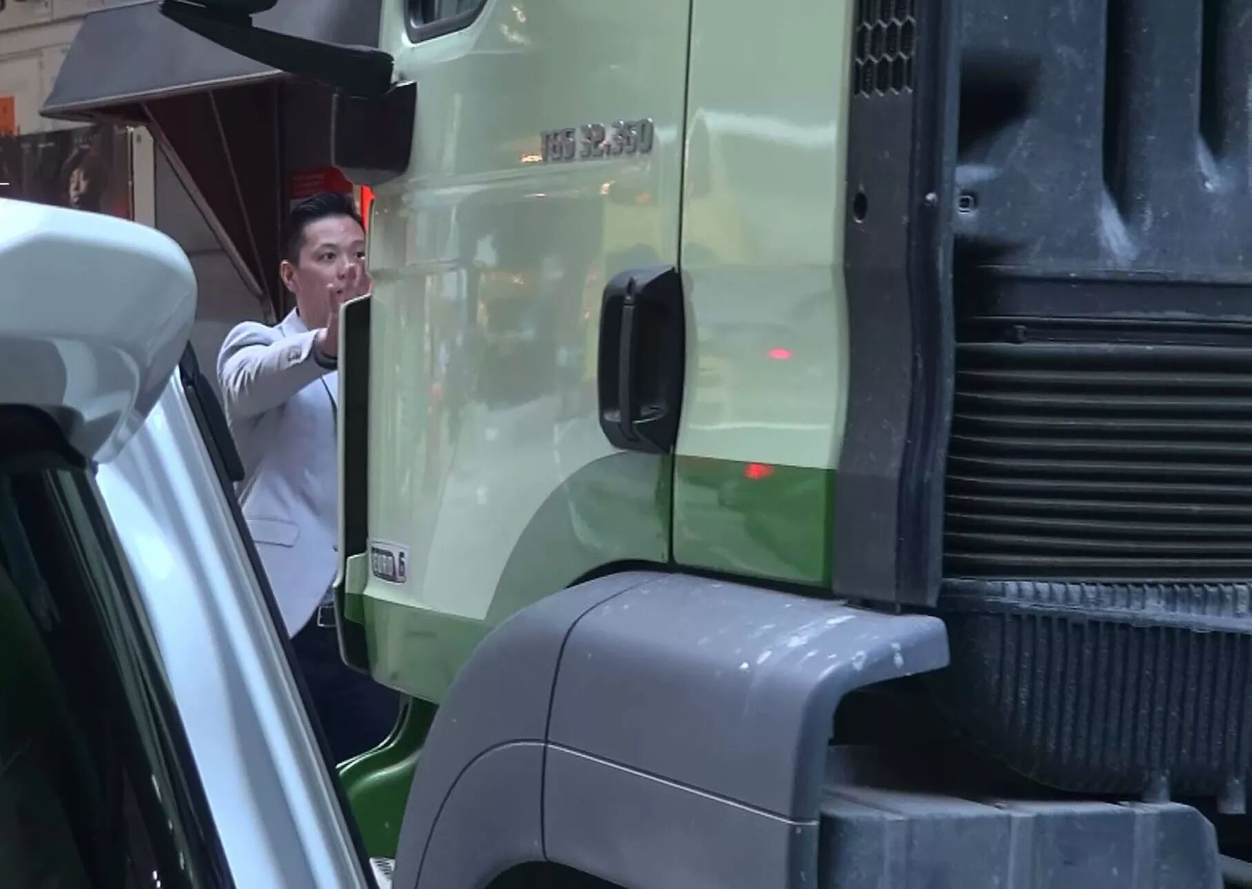 港媒称,李乘德很紧张太太,但因为动作实在太夸张,反而有点搞笑,货车司机也没有管他,哈哈。