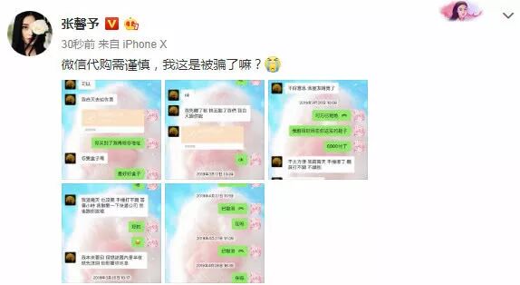 5月10日上午,女艺人张馨予在微博晒出几张聊天截图,发文:“代购需谨慎,我这是被骗了嘛?”,并附上了一个“大哭”的表情,想来心情也是十分郁闷。
