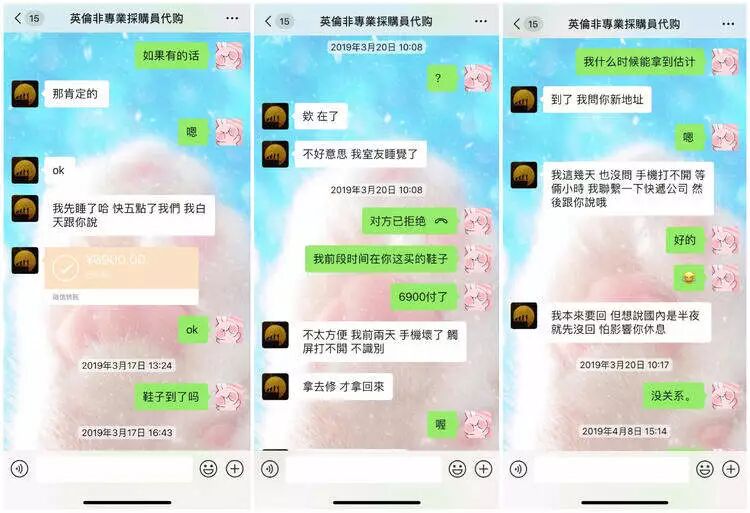 从张馨予晒出的微信截图看,她与微信代购的对话记录要从今年2月份算起,当时张馨予选择了先将货款6900元转账给对方。