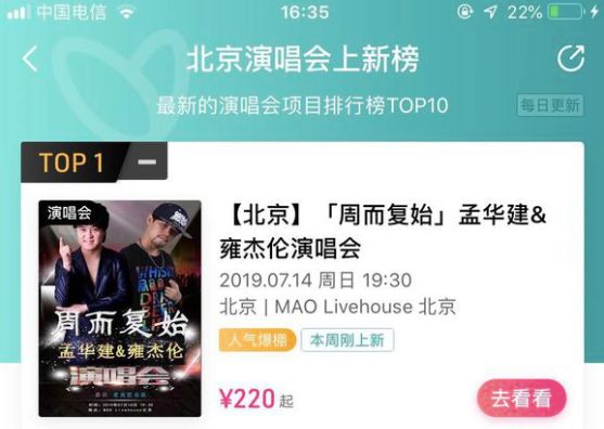 而两人这次的「周而复始」演唱会,在大麦网上直接被评定为「北京演唱会上新榜第一名」,远远甩开几十年前就拿过金曲奖的蔡琴。
