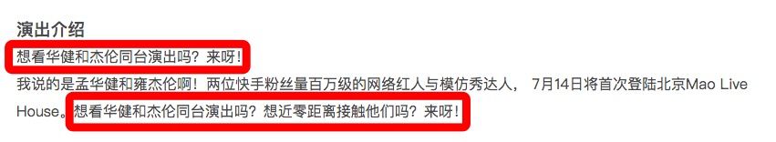 在大麦网的演出介绍的第一句:想看华健和杰伦的同台演出吗?来呀!