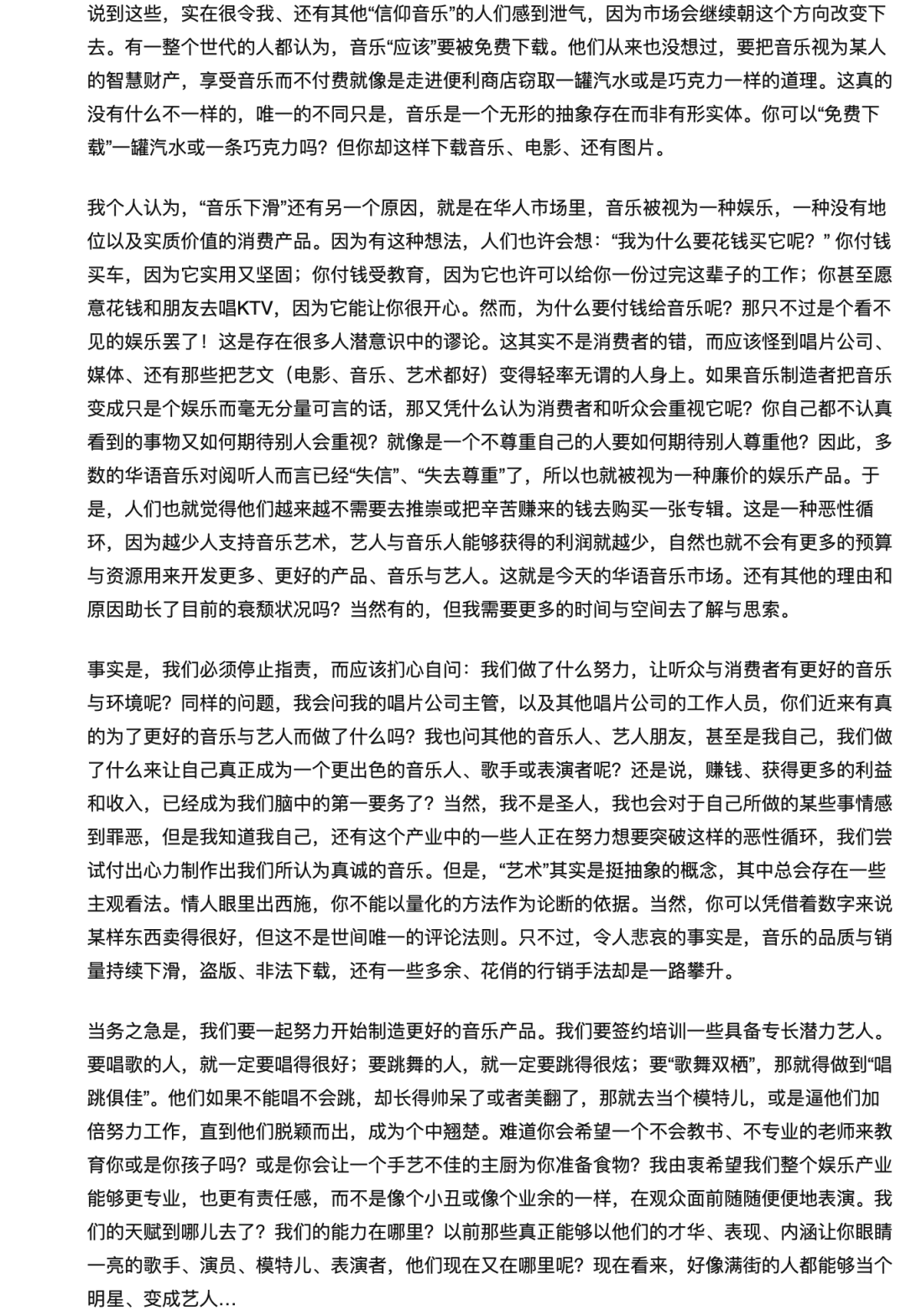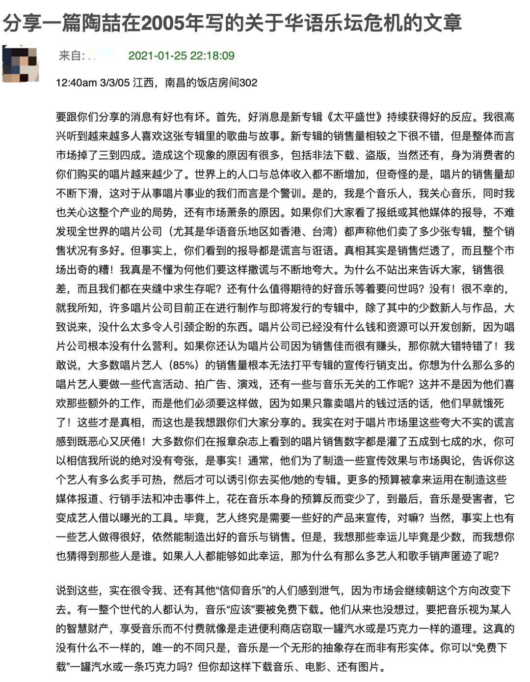 在 2005 年,陶喆发了一篇评价华语乐坛危机的长文。他强调了对自己的定位,是一名音乐人。