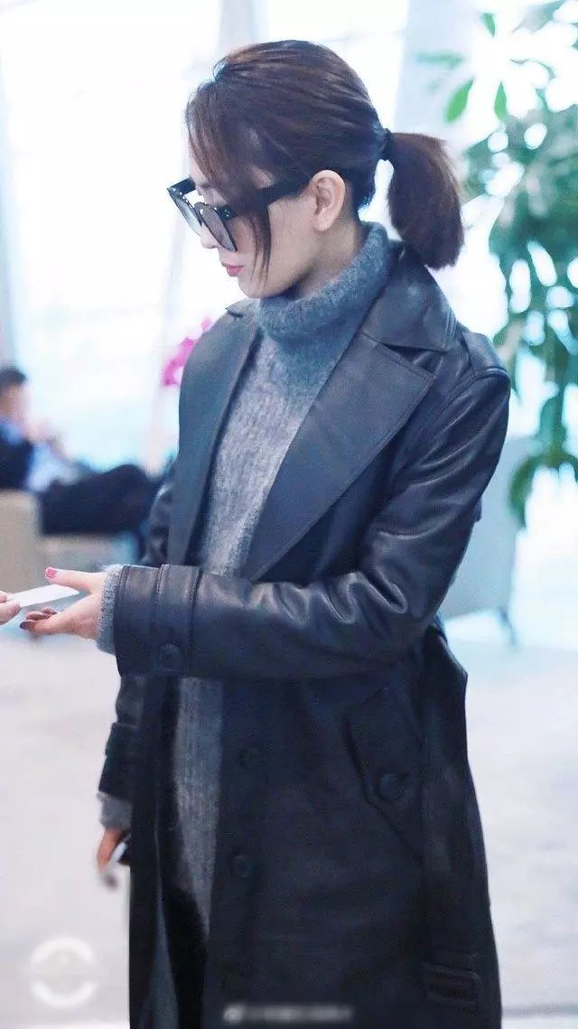 马苏在机场穿一身黑色长皮衣搭高领毛衣又酷又帅,气场十足,下半身搭配黑色高跟鞋也太时尚潮感了吧。