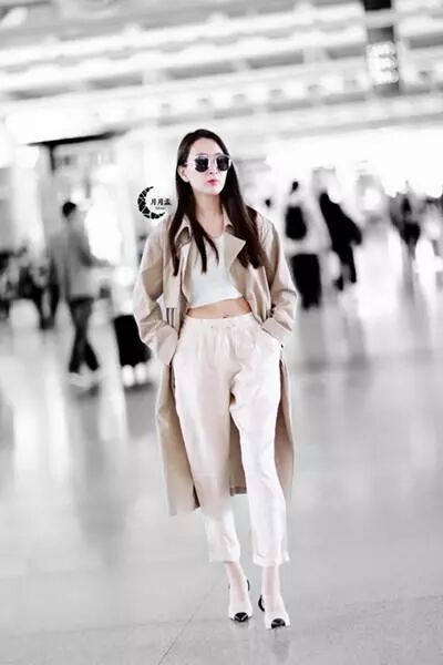 或者是穿长款卡其色风衣也很显气质,里面配上露脐小背心,白色九分裤,整个人很小清新有文艺范儿。