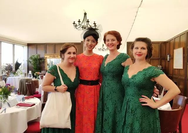 张梓琳和参加赛马会的其他女性合照中,身材出众这顶礼帽让她自带高级感。合照的三位女士穿着绿色的蕾丝长裙长裙,挽起发髻,看得出大家对这个活动是很看重的。这身蕾丝长裙颜色和款式来说真不错,上面精美的蕾丝花纹看着就很有质感,而且花边深V领带着满满的性感,比张梓琳的长裙好看多了。