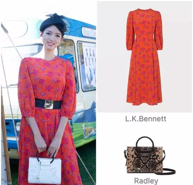 虽然都是大牌,但款式有些一言难尽,就拿她身上这件大红色的碎花长裙来说,颜色很喜庆,上面的碎花元素却是20年前的款式。黑色的宽腰带更显廉价,她这复古风走得实在太怀旧了,还以为这是上世纪的照片呢!
