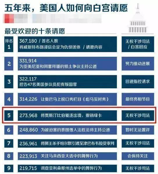 甚至在2014年的时候,比伯成为了白宫请愿榜上“希望赶快滚出美国”的那个人。