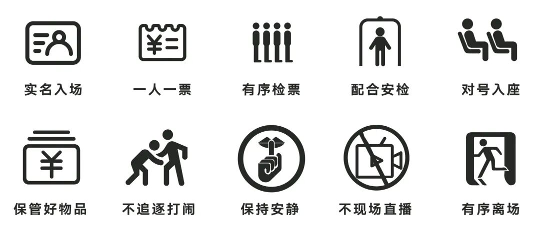 3.遵守公共秩序,对号入座,不得串区,不得聚集,不得跨越隔离带。严禁向场内或舞台投掷物品,切勿站立观看。注意安全,有序退场,不推搡、不逆行。