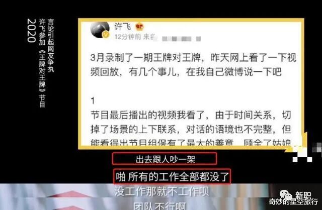 就在最近这几日许飞接受了一档采访,在采访中她表示自己其实现实生活中大多数是不能够很刚的,因为曾经在《王牌对王牌》这档节目当中,她和尚雯婕就是大吵了一架,而经过这么一场,几乎是所有的工作都没有了。在这段节目中,她表示谁还没有点脾气,都想刚,但是大多数时候不能刚,许飞当众开怼尚雯婕,如今沦落到工作全无,还直言再也不敢乱刚了