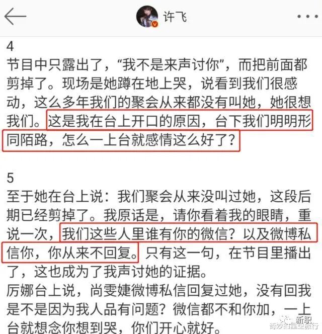 在这段节目中,许飞一登场便整个人看上去与其他人都不相同,而在节目进行的过程当中,她竟然公开指责尚雯婕,当着镜头的面直接怼尚雯婕说所以你为什么要把我们弄丢呢?这也就表达了尚雯婕如今跟她们的感情并没有多好,之间的友情并不是我们想象中那个样子的。令人没想到的是在节目里这样说了以后,她又在社交平台上发布了一篇小作文,直接开撕尚雯婕还说每一次遇见的时候都非常的冷漠,本来就形同陌路,然后却在节目里逢场作戏。