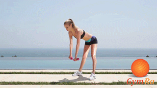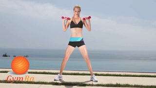 Step3:手握哑铃与肩膀平行,慢慢往下蹲。重复深蹲动作20遍。