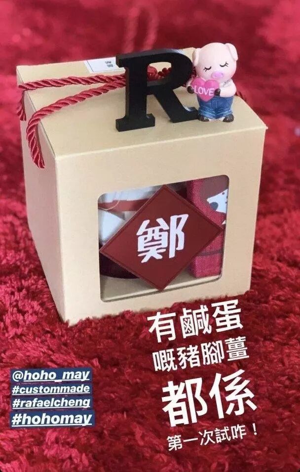 虽然只是一道菜,但郑嘉颖夫妇在包装上却是毫不含糊。不仅装在纸盒中,纸盒上还贴着郑字的贴纸,上面则用R字和粉色小猪做装饰。R字用来指代两人的儿子Rafael,小猪则是他的属相,而且猪还拿着写了“爱”的心形牌子,整个礼物温馨又实用,还充满生活气息。