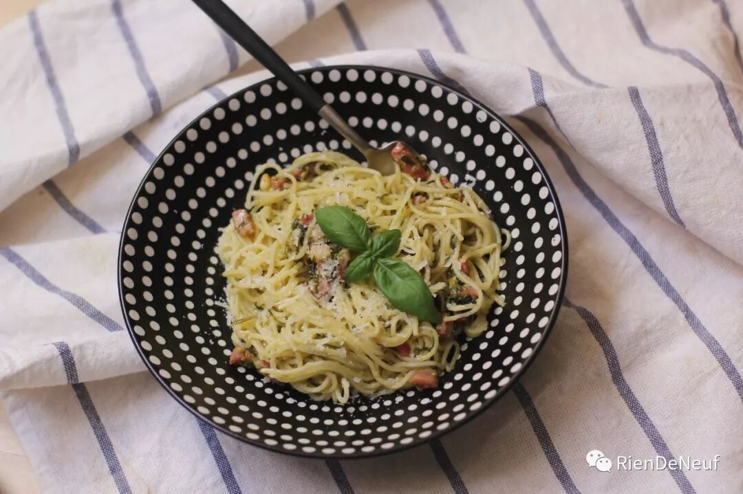 午餐的宗旨在于快手,越快越好,但是也不能难吃。搜罗一下冰箱里有什么就全都一股脑丢进锅里,从开火到端上桌不超过十分钟。不过好在还是我最爱的capellini细面,也贪心地撒了很多芝士上去,还不至于太差。