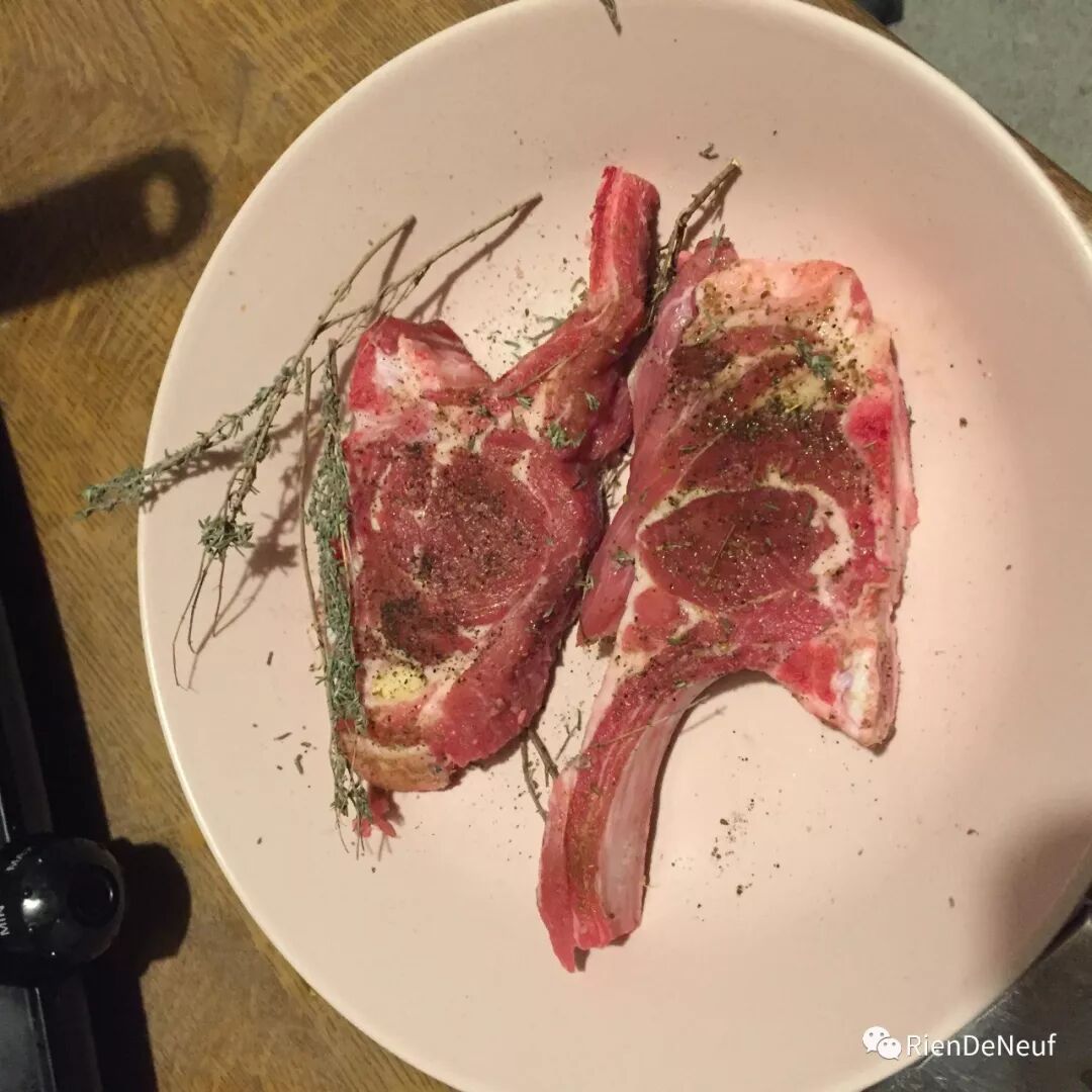 两面在滚烫的平底锅里用黄油各封煎一分钟,接着放进预热过的烤箱200度烤十分钟,完美。家里没有迷迭香就用了炖肉用的百里香,味道一样很好!