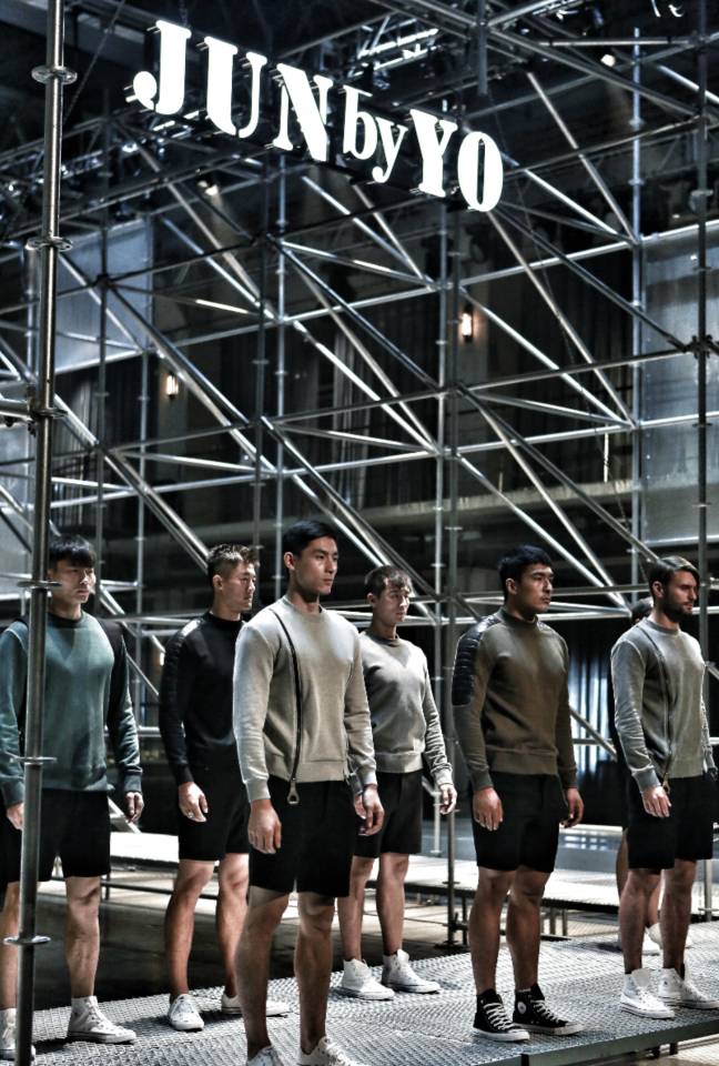JUN by YO ---胡军先生和王怡鸥女士首创时装品牌,2016全系列男装发表秀霸气登场,名为“行走荷尔蒙”的时装发布会,现场将以工装仓库及建筑硬材为灵感营造都会阳刚氛围,并由近40位肌肉男模演绎59套新品,引爆专属中国男人的硬朗刚强独有魅力。