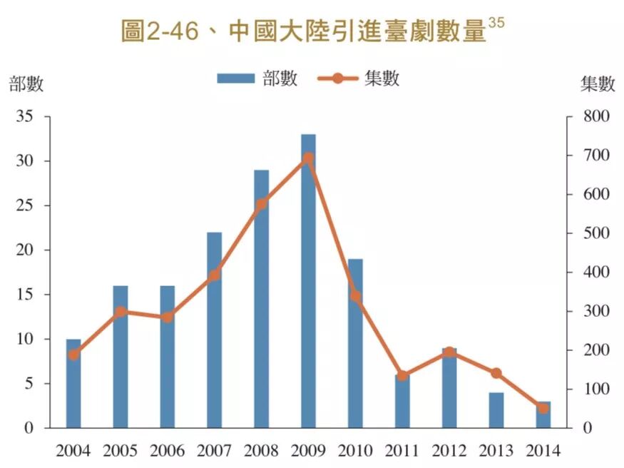 1996年,台湾出口贸易第1名是美国,中国大陆23名,排在柬埔寨后面。1999年,大陆上升到11,2001年大上升到4,仅次于日本。从2004年开始,大陆一直是台湾第一大市场。微观到影视产业,2004年到2013年的10年间,大陆平均每年引进台剧16.3部,占所有引进剧的19.7%,并于2009年达到最高点。之后呈不断下降的趋势,到了13年仅剩3部。数据披露了一个现实,台剧的竞争力越来越弱,台湾艺人出场费翻三倍的时代已经一去不复返。