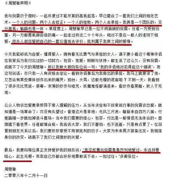周慧敏与豪门浪子,30年出轨8次:开放式婚姻,背叛真的值得原谅吗? 凡小西 港台女星 2020-05-07 15:40:11 786 创作不易,用心坚持,欢迎请BaGua喝几杯爱心咖啡!打赏并支持本文 打赏并删除本文 五一假期,我带着孩子回娘家了。几个小伙伴也都抽时间聚在一起,好久未见,大家聊得挺嗨的。我们不仅谈老公孩子,还谈儿时的偶像,嗯,就是现在00后说的“爱豆”。说到“爱豆”,我们都有一种感慨,随着医美越来越发达,现在娱乐圈里的女明星愈发精致完美,却也少了一份独特的灵气。用亦舒师太的一句话来形容:美则美已,毫无灵魂。说到美得有灵魂的,还要数早些年间香港的那些女明星,各有千秋。比如说,周慧敏。“她曾经集万千宠爱于一身,这么多的玉女,都是起源于她的名字。”20世纪90年代中期,样貌温婉的周慧敏不仅是无数少男的梦中情人,还是娱乐圈里炙手可热的红人,不仅演技在线,唱功也是了得。1988年,21岁的她凭借着喜剧《三人世界》,获得了第8届香港电影金像奖;同年11月,又凭借着个人首张同名EP《周慧敏》,获得了“金唱片”的好成绩;1989年1月获得香港电台第11届十大中文金曲最有前途新人奖优异奖。一时间,风头无两。事业于她而言,可谓是顺风顺水。可是浮华名利,并不是她所关心的,在事业如日中天的时候,她为爱选择宣布息影淡出娱乐圈。如果说是值得爱的人,那么当然祝福周慧敏。可她偏偏活得让所有人都觉得惋惜。因为这个男人是倪震,出了名的花花公子。周慧敏和倪震第一次见面,是在1989年两人共同主持《摩登时代》的综艺节目上。那时,倪震刚刚和李嘉欣分手,见了周慧敏后,他就对她展开了狂热的追求。为了追到周慧敏,倪震也花了不少心思:为了哄周慧敏开心,他在她演唱会上特意扮成了她最喜欢的宠物猫,单膝下跪示爱;为了买到周慧敏喜欢吃的巧克力蛋糕,他转遍整个加拿大,只为给她找到最可口的;她开口说想吃奶酪,他立马开车跑几个小时到美国买,只为她一笑。“他是一个很好很好的男朋友,靠得住、成熟,是一个真正的男人,我真的很幸运。”倪震卖力的讨好,不仅追到了周慧敏,还得到了她完全的肯定:不仅多次在媒体面前感谢倪震对自己的付出,还为了他一句“不喜欢爱人在娱乐圈”就果断的决定息影淡出娱乐圈。在周慧敏看来,一份事业换一份真挚的感情,很值了。在做客《康熙来了》里,周慧敏就一脸幸福地说道:“我先生喜欢照顾人,我是被照顾的人,平常去超市、处理家务都是他做。他是那种认真、细心和肯负责任的男朋友,由始至终他对我的态度,每件事也将我放在重要的位置。”倪震的表现让周慧敏很满意,她开始慢慢适应了倪震女友这个角色,逐渐沉溺在这个男人给的感动里。但是她忘了,倪震的本质是一个怎样的男人?倪震可是香港兰桂坊出了名的浪子啊。一个浪子,哪有那么容易回头?1994年,倪震和女星陈法蓉传出绯闻,“蓉敏相争”一时间成了各大新闻的头版头条,周慧敏一气之下,和倪震分了手。但是让人不解的是,两年之后,两人又重新复合了。轻易得到的原谅,没有人会珍惜。2001年,倪震为香港名媛姚乐碧新书《随意随心》写的情欲序言曝光:“我和姚乐碧的确在口舌言谈上达到过颇为剧烈的高潮。”不仅如此,姚乐碧还公布了倪震写给她的情书:“假如你不是结了婚,一场轰轰烈烈的恋爱,我是舍命相陪定了的。”言辞之间,暧昧无比。2006年,倪震又和陈颖妍传出绯闻,次年又被爆和各种嫩模,夜店小姐厮混在一起。根据港媒的报道,倪震至少有8次出轨,光周慧敏捉女干在床就有3次。影响最大的还要数2008年倪震被爆出和女大学生激吻照的舌吻事件。“倪震携三名衣着暴露的时尚美女出现在香港某家夜店,三人在酒色迷离中把盏言欢……凌晨1点左右,倪震迫不及待的和那位美女协同离开。终点站是哪里,答案不言自明……”舌吻事件曝光以后,周慧敏终于下定决心和倪震分手。然而让人大跌眼镜的是,分手不到一星期后,两人就复合了。“没有倪震就成就不了今天的周慧敏,所以,我敢大胆向各位说一句:我的伴侣绝对犯的起这个错误……”更狗血的是,两个人在之后的20多天里,立马宣布结婚了!这一波操作,让不少网友表示无法认同,更无法理解。如果拿婚姻的幸福度来说,我相信周慧敏的这个决定并不是明智的选择。因为在08年的舌吻事件后的2020年,56岁的倪震再一次被传出轨了。4月8号,就在周慧敏宅家忙着宣传呼吁大家少出门时,倪震却在另一头忙着和别的女人约会逛街。两人十分亲密,行为举止宛如热恋的情侣。但周慧敏没有任何回应,或许她对这样的新闻已经有了免疫力吧。毕竟,枕边人是什么样的,她自己最清楚。渣男就是渣男,你就算是天仙,他也会惦记着外面的屎。你既然可以屡次选择原谅,那你就要接受他不停出轨背叛的事实。但是,世上又有几个女人可以发自内心接受自己的所爱之人在外不停的惹花花草草呢?《如懿传》中,即便周迅扮演的如懿早就深知,帝王会有许多嫔妃,可最终她也最终被皇上一次次为其他女人发狂,而寒心。我记得周慧敏在很久之前做客一档综艺节目的时候,说过一段话,大意就是:她结婚不在乎对方有没有钱,或者长得帅不帅,重要的是和自己三观一致,简单的幸福就可以。这才是她憧憬的婚姻,但是如今呢?老公不断出轨,她不停道歉,这和她憧憬的婚姻完全就是背道而驰。但是如果拿对婚姻的