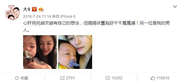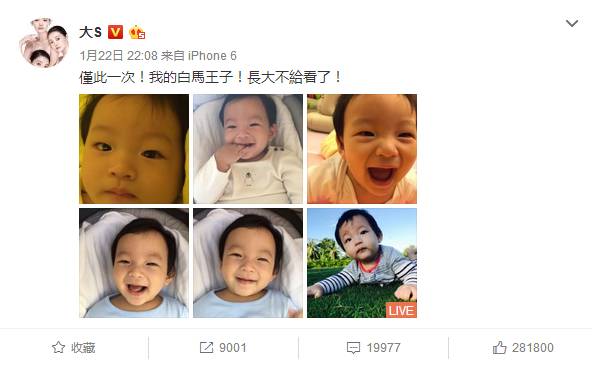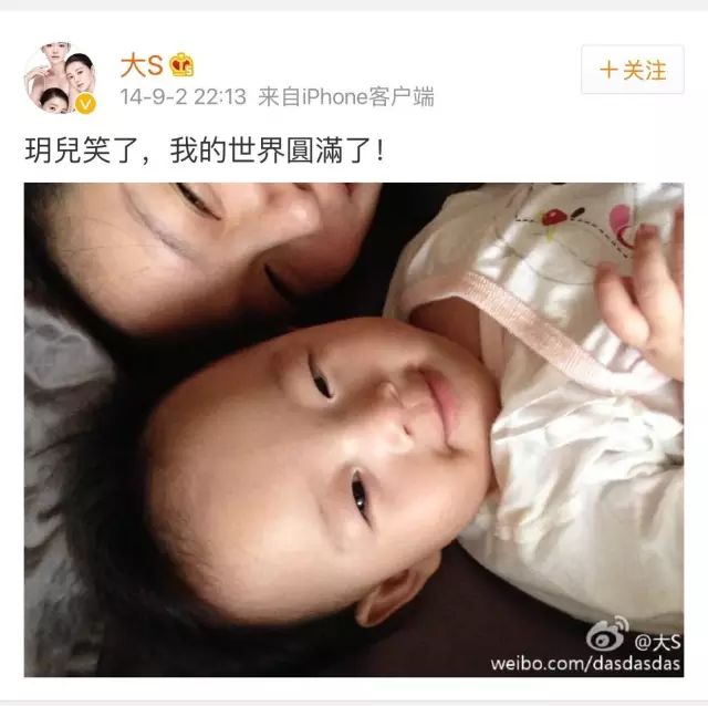 生下女儿后,大S开始敢于在微博上晒出自己的素颜照。