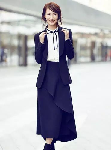 黑白搭配知性优雅,白衬衫搭配不规则黑色长裙,修身的西装外套更突显金晨的好身材,细带蝴蝶结领带也很有特色哦,蓬松的低马尾增加气质。