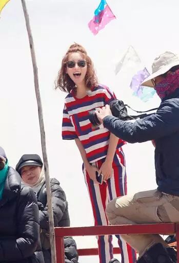 金晨皮肤够白,身着红白蓝条纹套装,完全不显俗气,反而更有时尚范。可周围的大妈都是穿着羽绒服,金晨美眉为了节目效果可真拼呀~