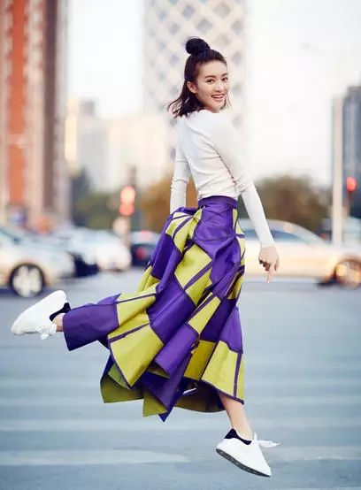 扎着半丸子头的金晨特别灵动活泼,白色修身上衣搭配紫黄撞色半身长裙,十分显眼出彩,脚踩白色运动鞋增添金晨该有的活力感。