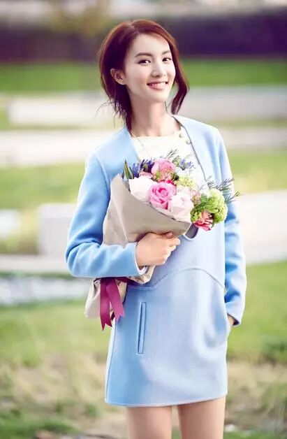 金晨的笑容很甜美,她身穿的浅蓝色V领连衣裙,清新恬静,手捧的鲜花与整体气质非常相配,简直是笑魇如花呀~