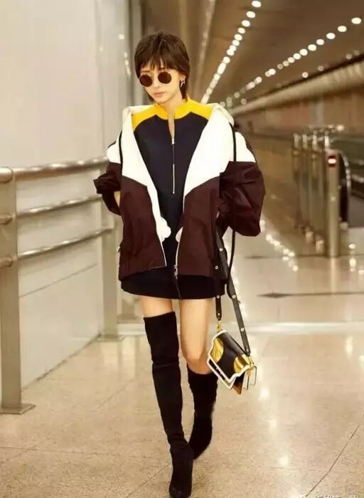 王子文也是和周冬雨有得一拼,运动外套+连身裙,再加一双黑色过膝靴的不规则穿法,将拼色进行到底,也真是潮出了天际。