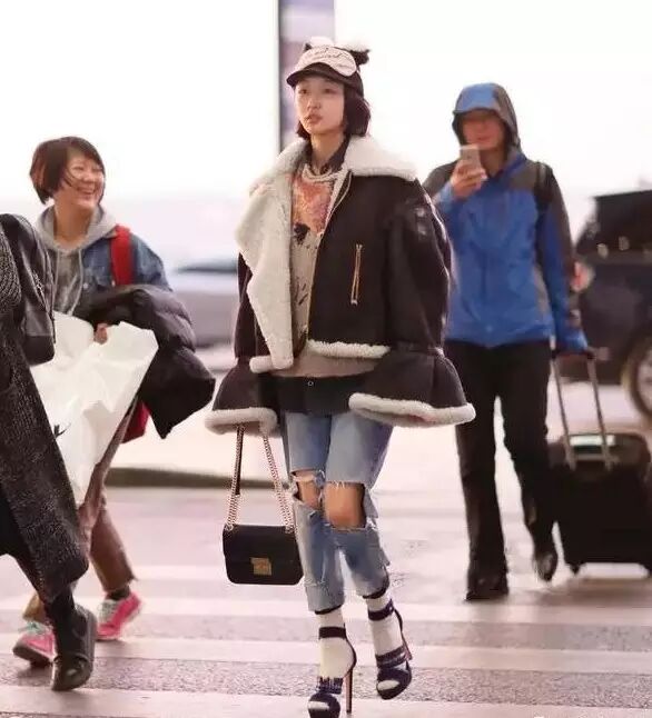 周冬雨身穿棕色皮毛一体喇叭袖机车夹克帅气,内搭彩色毛衣和黑色牛仔衬衫,下穿破洞卷边牛仔裤,脚穿白袜和亮片防水台细高跟凉鞋,简直将混搭进行到底!