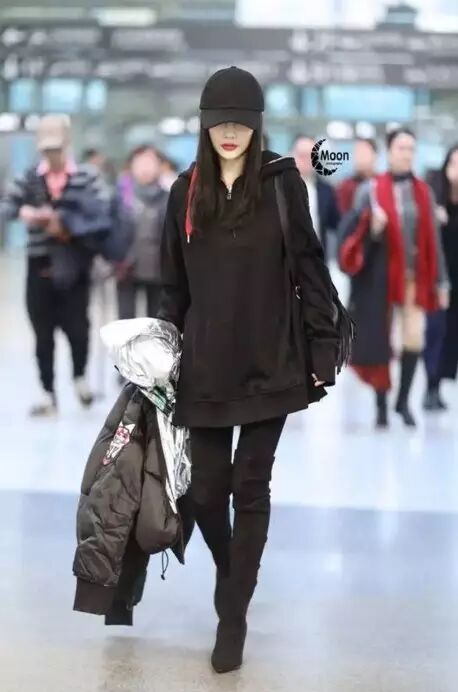 李小璐这套也是相当随性休闲,ALL BLACK的搭配看起来确实相当的酷。