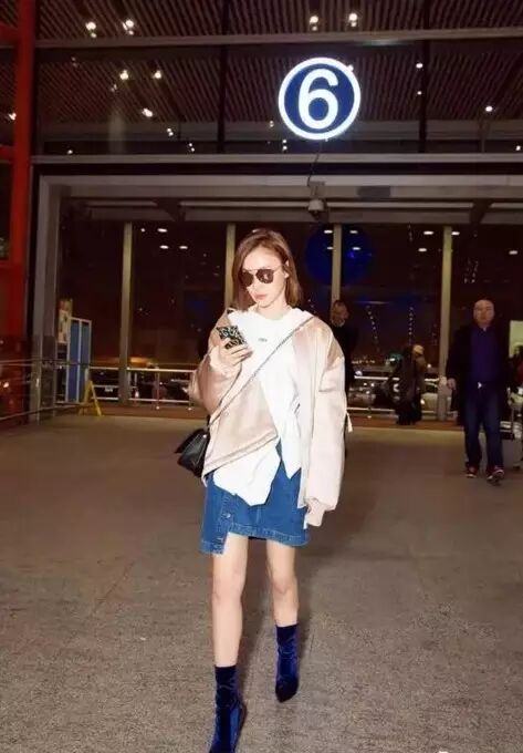 袁姗姗这身oversize的棒球服,搭配不规则的牛仔短裙,看起来就活力十足。蓝色丝绒短靴更是让她看起来多了一丝复古气息。