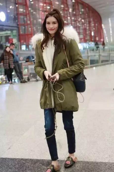 何穗这身军绿色毛领派克大衣,内搭白色圆领毛衣,下穿深蓝色抓痕印花牛仔裤,搭配得中规中矩。