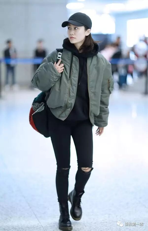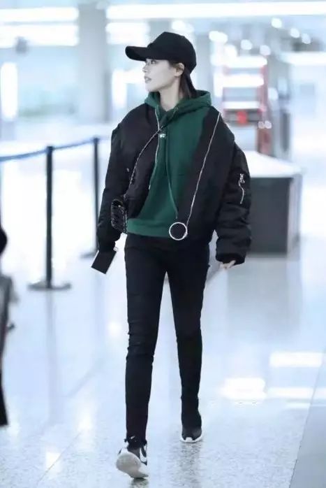 大家仔细看刘芸,几乎是素颜出街,皮肤也是相当的好。军绿色飞行员夹克搭配全黑卫衣,显得特别帅气。