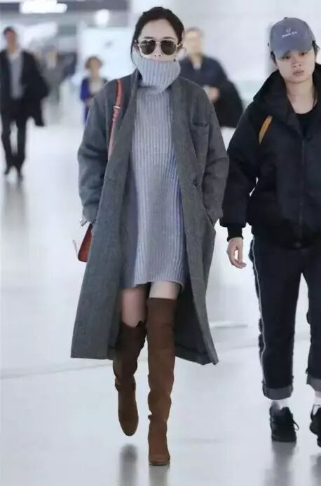 最爱穿大衣的人非杨幂莫属了,灰色大衣内搭同色系的高领毛衣,可谓是绝配,脚上穿着长靴点亮了整套搭配。看起来相当干净有精神。
