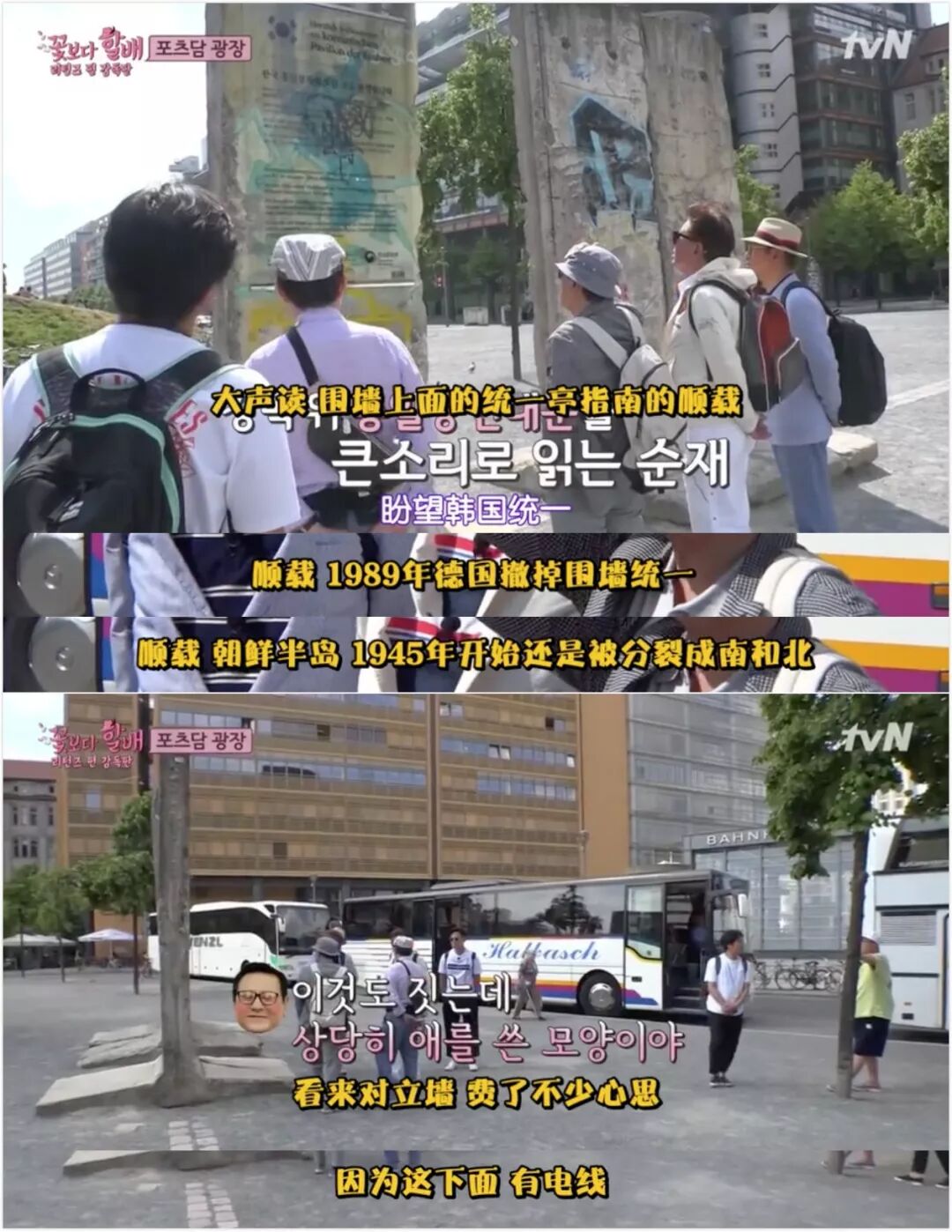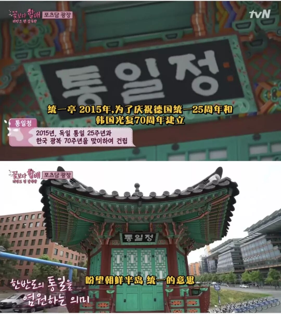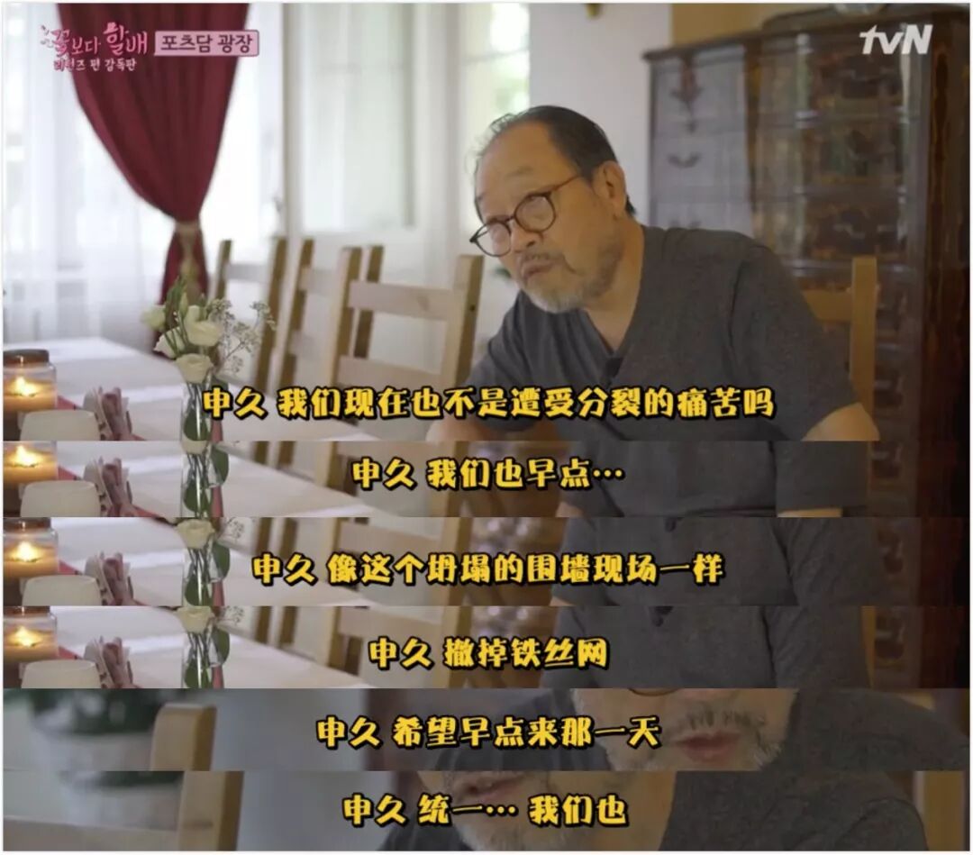 在此前播出的韩国综艺《花样爷爷》中,年近七旬、经历过分裂变故的爷爷们去到了柏林,在柏林纪念墙附近的统一亭那里,停留了很久。