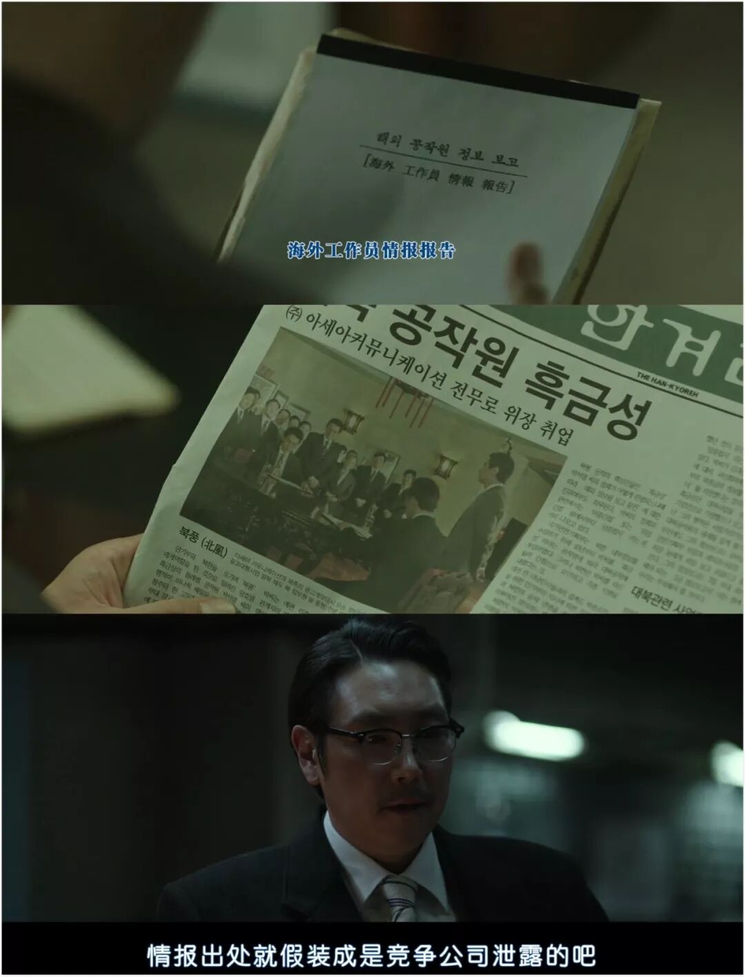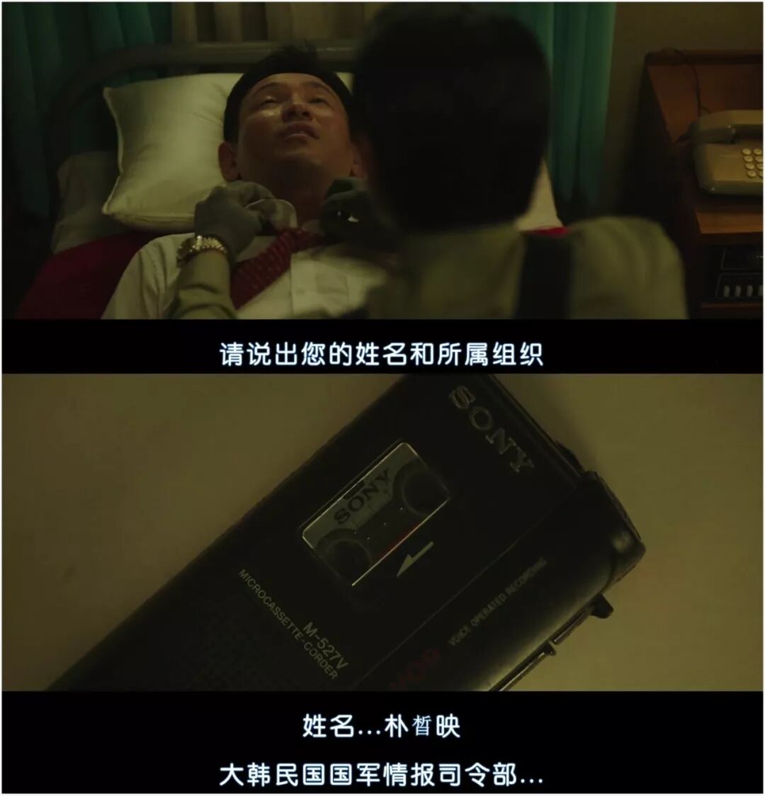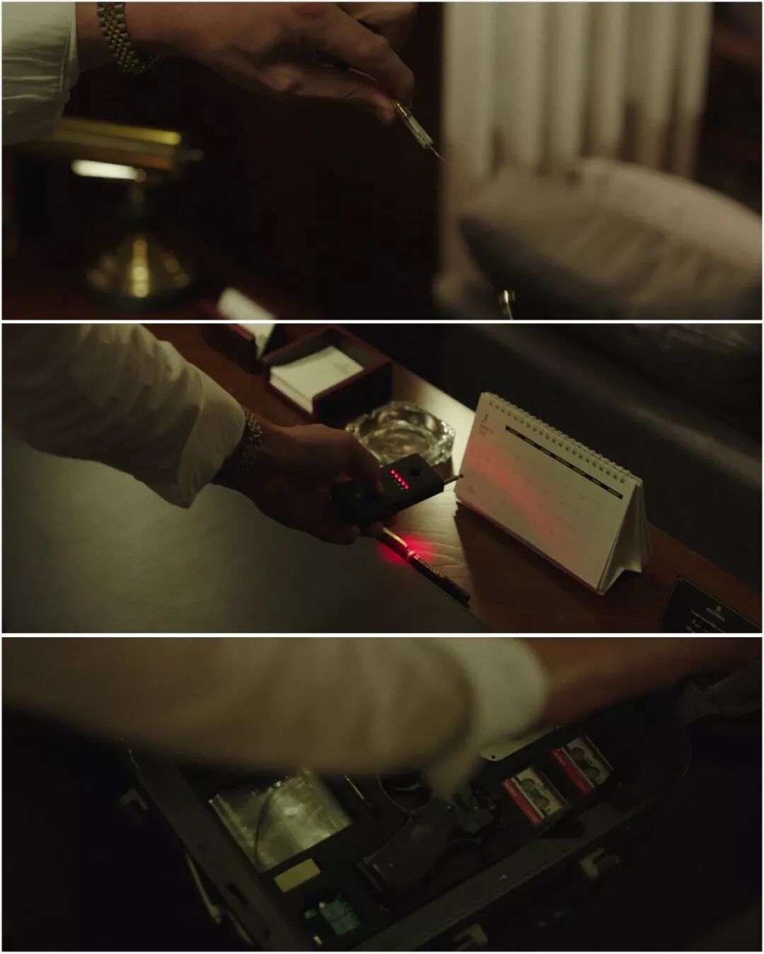 还有闯进朝鲜酒店房间后一副堂堂正正、装蒜的模样,迅速将窃听器塞进了沙发缝隙中。