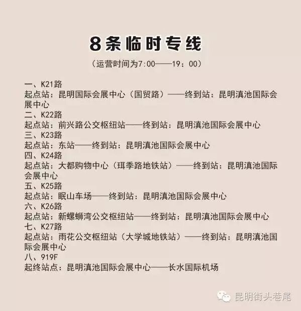 ●管制道路:机场高速、东连接支线、二环快速系统、东绕城高速、南绕城高速、人民东路、人民中路、翠湖环路、北京路、环城南路、春城路、国贸路、海明路、关兴路、宝海路、滇池路、红塔东路、前兴路、福保路、官南大道、环湖东路、广福路、昌宏西路、珥季路、湖滨路、巫家坝路(原飞虎大道)等。根据活动需要实行临时性交通管制措施,期间除参加活动的车辆外,严禁在上述区域道路上停放车辆,禁止无关车辆通行。
