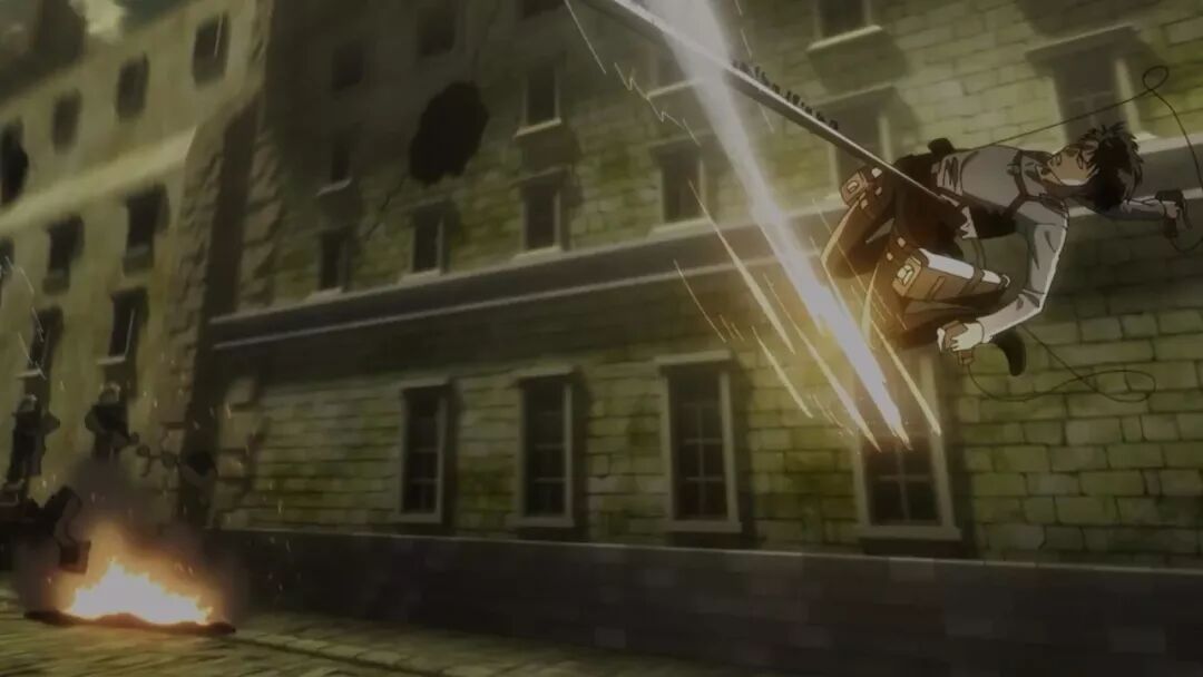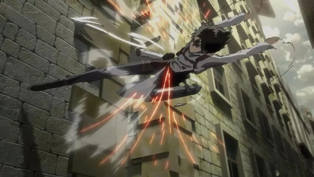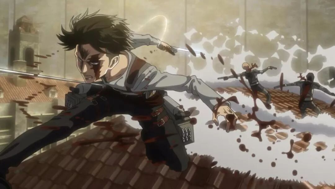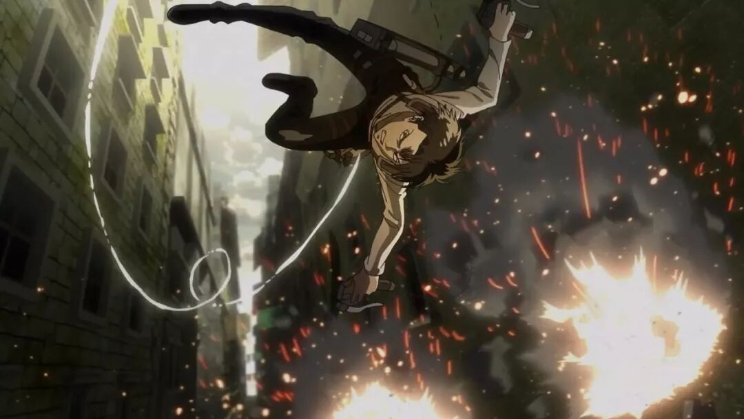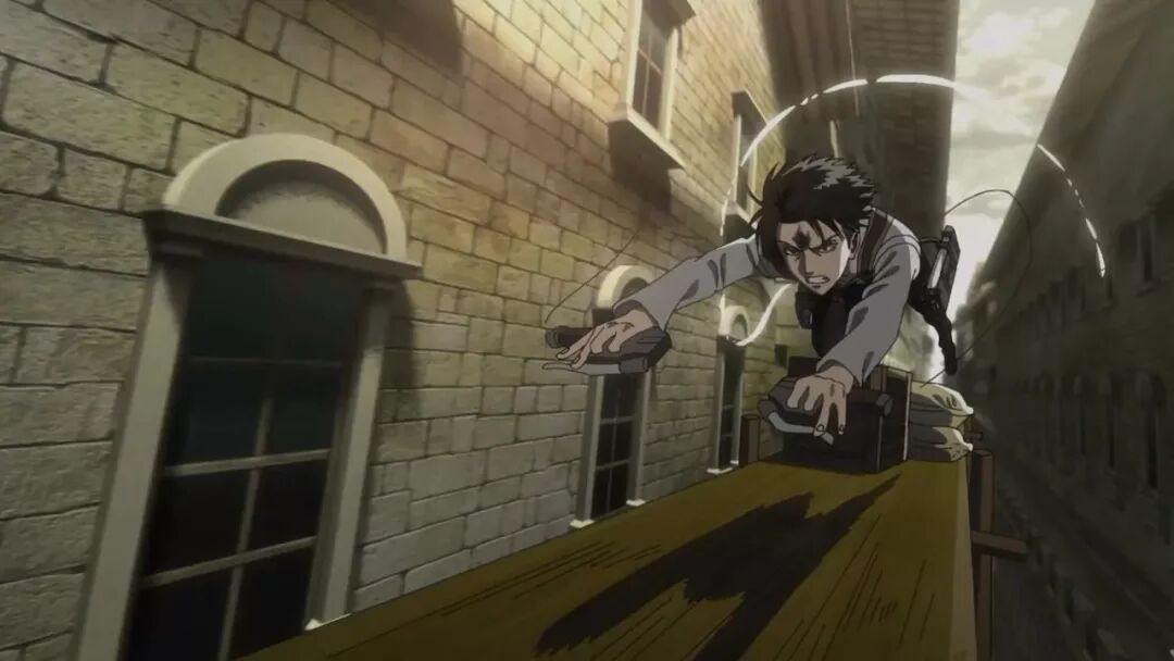 动画组在动作场面上总是偶有一些用力过猛,比如第二季最终话的希斯托莉娅的720度体操秀,像兵长这记立体机动装置的螺旋发射,其玄学程度也像是制作组玩嗨了,看着就像是在发射激光波。
