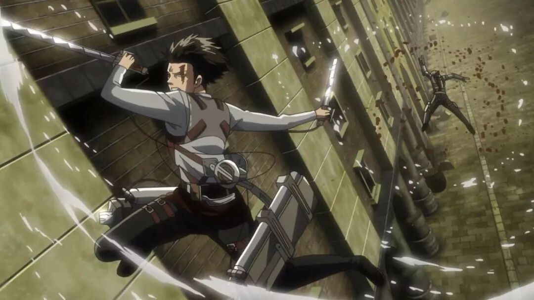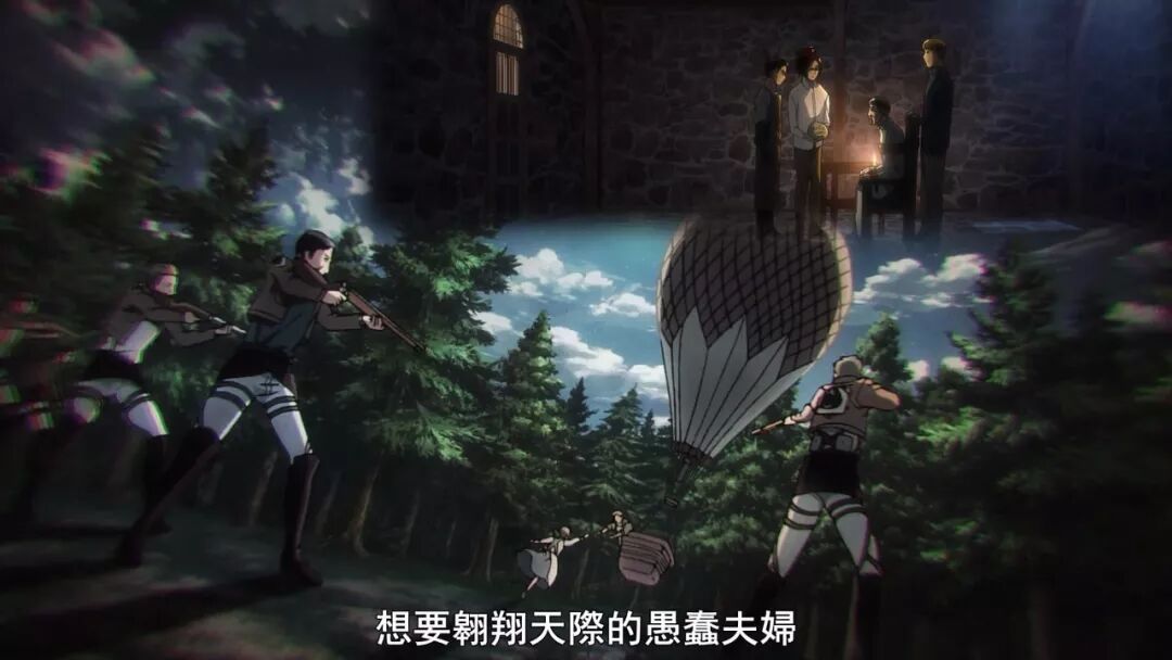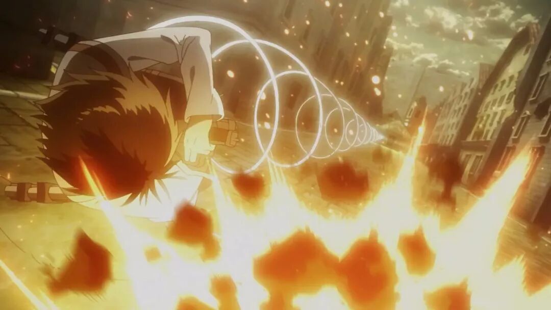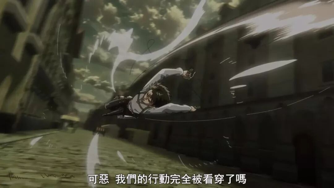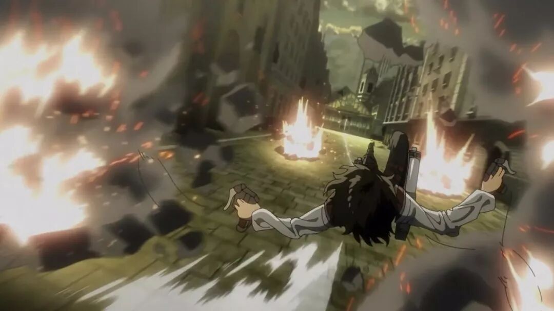 动画组在动作场面上总是偶有一些用力过猛,比如第二季最终话的希斯托莉娅的720度体操秀,像兵长这记立体机动装置的螺旋发射,其玄学程度也像是制作组玩嗨了,看着就像是在发射激光波。