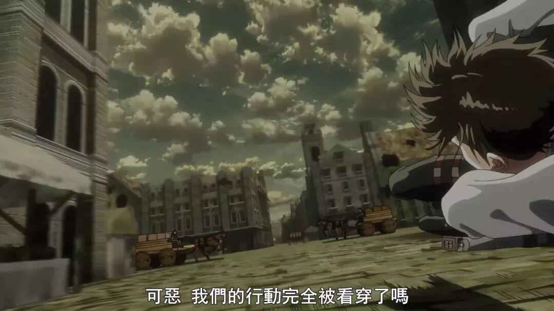 这个镜头拉伸了景深,把两位宪兵放到更远景的位置,漫画中二人身影在画中更大更近,脖子被削开了一大半,动画版的尺度自然要有所和谐。兵长削人的后颈,正如整个王政篇的缩影,接下来将是人类之间的战斗。