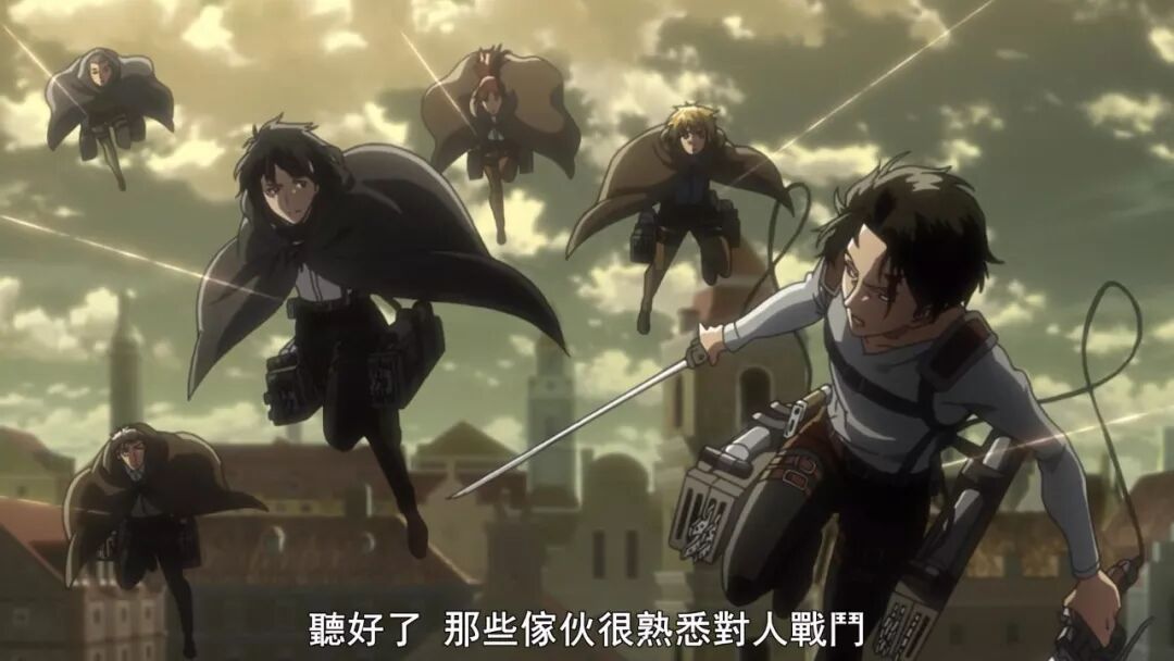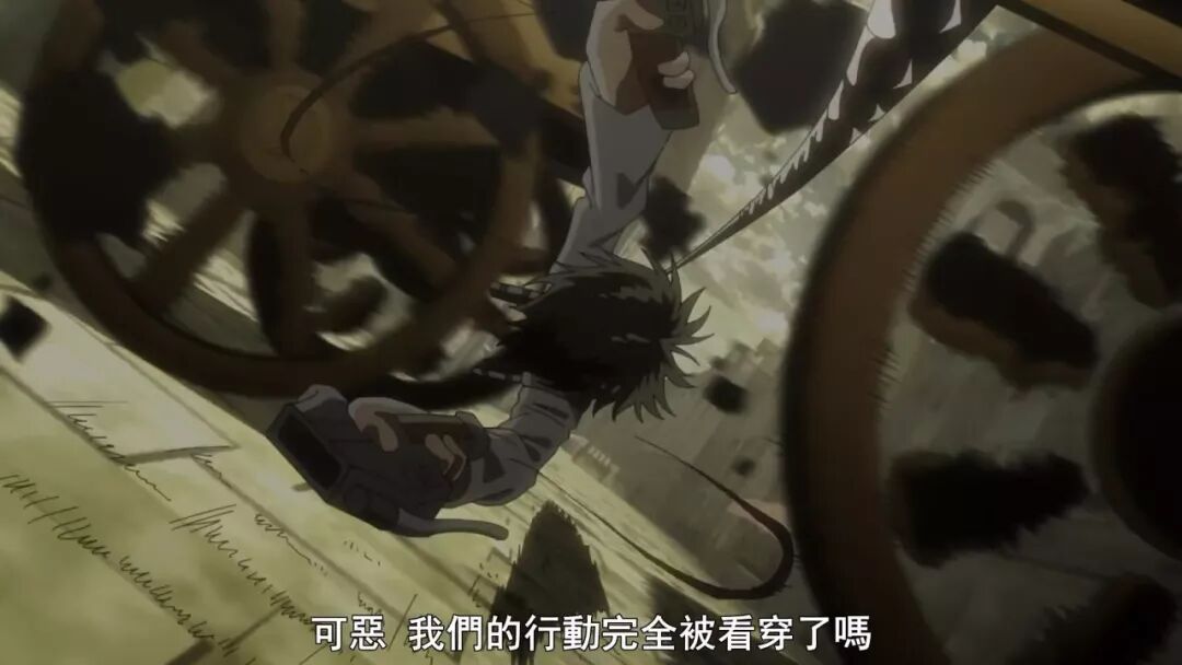 但这场动作戏相较原作最大的损失,还是来自于故事情节。漫画中,这场战斗的前情是兵长和商会谈妥合作,用艾伦和希斯托莉娅引出幕后黑手,结果被凯尼识破,杀了会长,嫁祸调查兵团,兵长上了通缉令,随后反用艾伦和希斯托莉娅引出利威尔一行人马,想将兵团一网打尽。彼此对招的智斗,连环计中计,栽赃,策反,潜伏,带有间谍片的氛围,战斗的前情铺垫非常丰厚,直至一触即发,短兵相接。