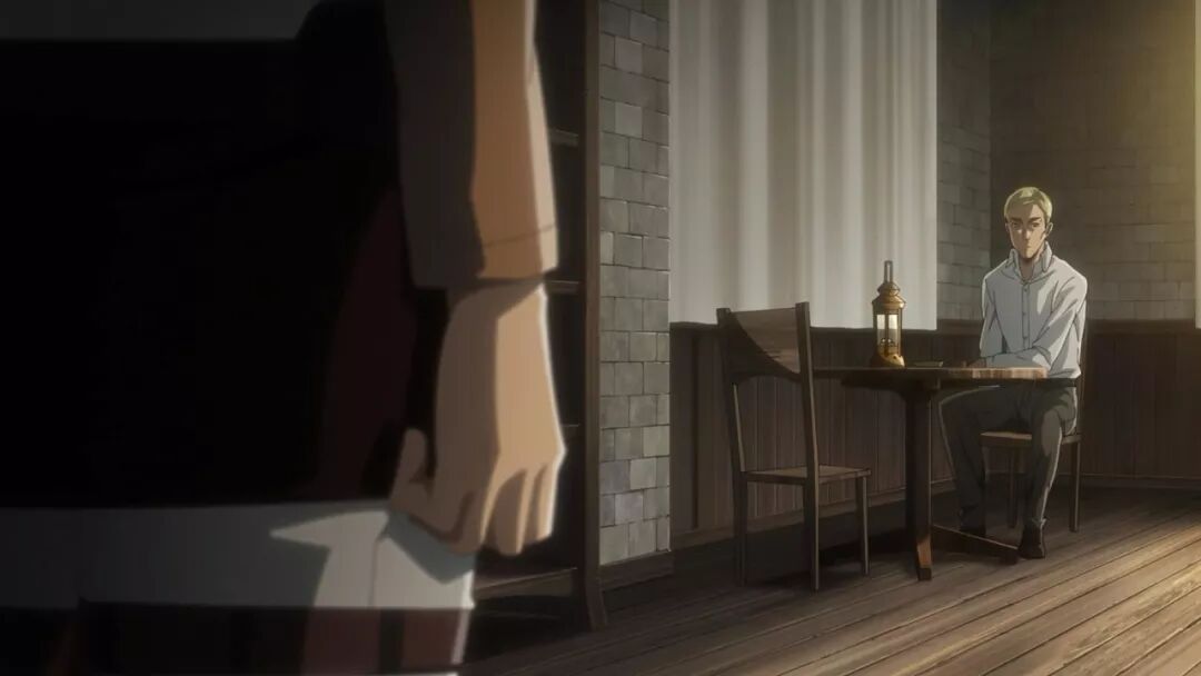 现在来看,团长似乎是被宪兵软禁,与宪兵团长兼昔日同窗奈尔的对话,也从前往王政府开会的马车上,改到了室内,对话内容同样出现了大幅删减。我自己很喜欢的一句台词,团长在艾伦夺还战中失去右臂,奈尔形容为【如今终于将右手伸到那个世界去了吗?】,便被略去。