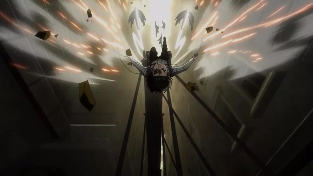 不过可能是预期的太高,我以为这场戏应该是立体机动装置的高峰之作,超越第一季艾伦前往堵门巨石的长镜头,以及OAD《无悔的选择》中兵站与团长相遇的那场追击。但整体效果上,至少没有突破先前的珠玉。而对比漫画原作,虽然动作没有动画版酷炫,但谏山创的分镜更突出运动的劲道,以及城市里飞舞追逐的空间感,简洁而有力。当然如此计较也只是因为这是《进击的巨人》,综合水准上也算是各有千秋。