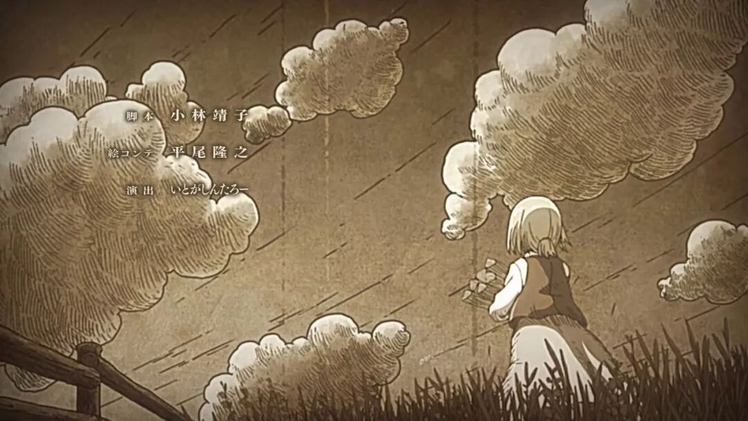 第三季的ED现身,包办前两季3首OP的REVO和他的Linked Horizon跑到了ED,依然就是大家熟悉的风格,恐怕一时会让观众觉得第三季的OP和ED拿反了。新ED《晓の镇魂歌》,童谣配唱,以希斯托莉娅的童年为线索,黑白昏黄的铅笔画,莫名有点《天空之城》和《风之谷》既视感。