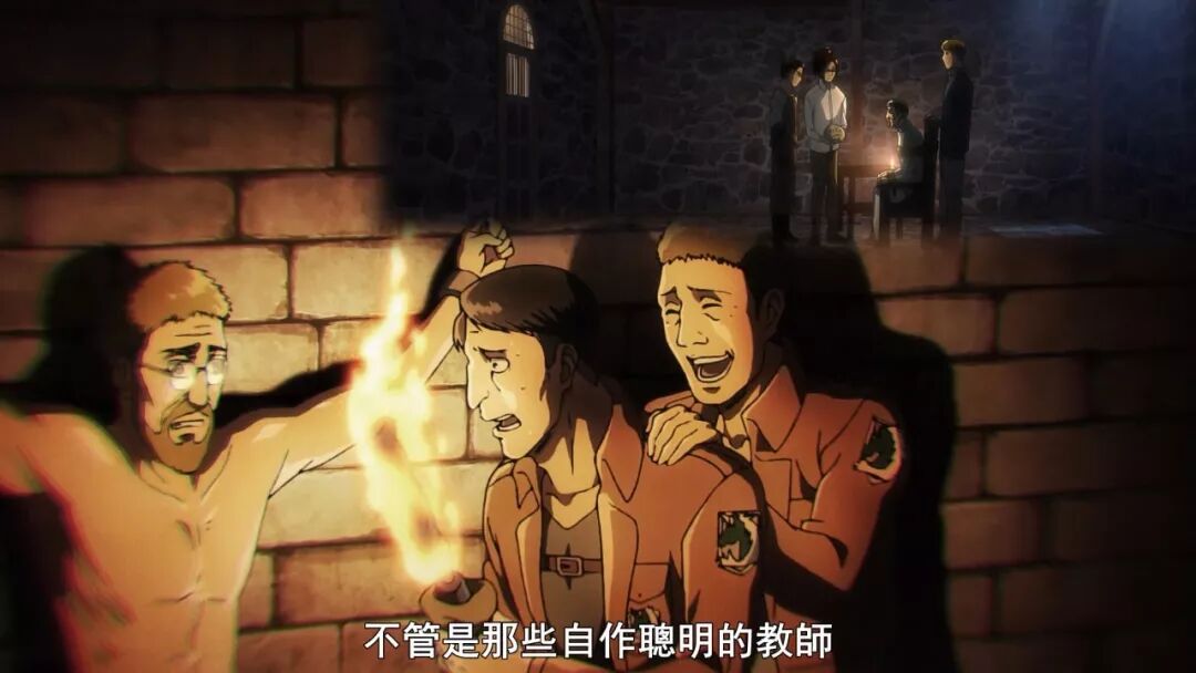 作为大众知名度越来越高的商业动画,第三季又是在日本的CCTV,NHK电视台播放。韩吉和兵长刑讯逼供宪兵特务萨内斯的拷问戏,意料之中的避重就轻,匆匆带过。然而动画限于单集时长,几乎连一丝人物情绪释放的空间都没留。萨内斯被骗之后的招供,剪辑之快简直就像恶搞视频。