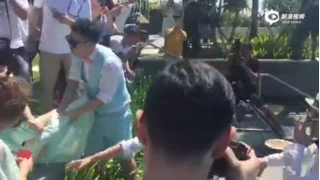 包贝尔带伴郎团把柳岩放到,四个人抬着柳岩想把她扔到水里,包贝尔伴郎是... 伴郎团里只有一个人没动手 就是李灿森...