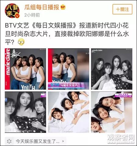 这组图片由《嘉人》杂志拍摄,将关晓彤、欧阳娜娜、文淇和张子枫四位年轻艺人归为“新时代的四小花”,照片画风靓丽,但是由于太容易联系到“新四小花旦”,本就引发了一些争论。