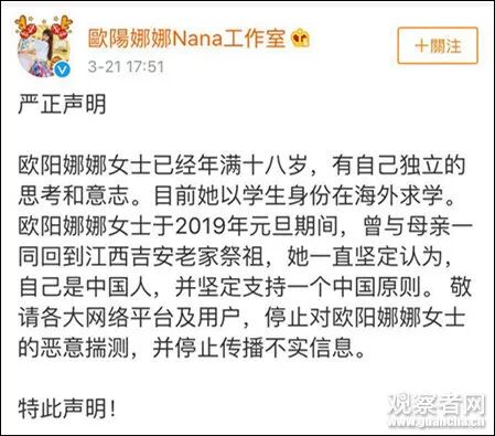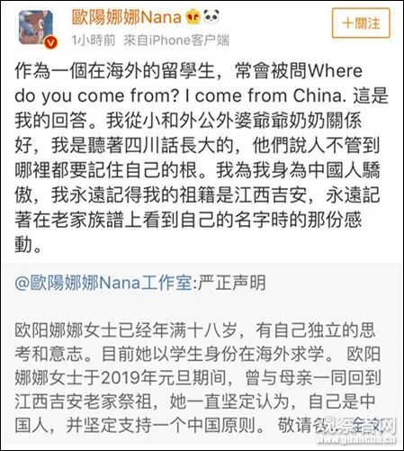 “欧阳娜娜曾与母亲一同回到江西吉安老家祭祖,她一直坚定认为,自己是中国人,并坚定支持一个中国原则。 ”