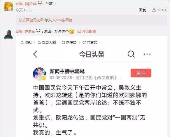 欧阳娜娜又为何被单独“针对”呢?热门评论均指向了她的父亲、国民党发言人欧阳龙。