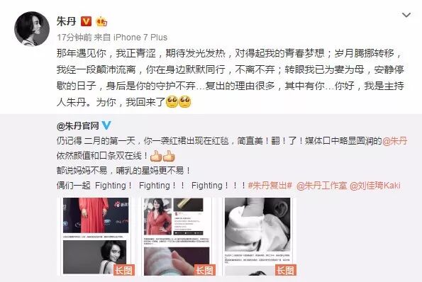她发文感慨:“那年遇见你,我正青涩,期待发光发热,对得起我的青春梦想;岁月腾挪转移,我经一段颠沛流离,你在身边默默同行,不离不弃;转眼我已为妻为母,安静停歇的日子,身后是你的守护不弃…复出的理由很多,其中有你…你好,我是主持人朱丹。为你,我回来了。”
